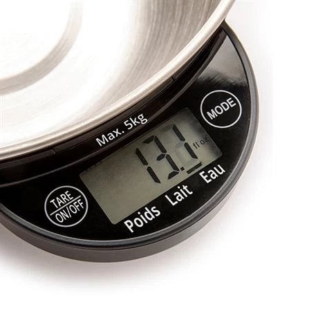 Cette balance de qualité pèse au gramme près vos aliments solides et liquides jusqu’à 5 kg. Doté d’une fonction Tare, elle vous permet d’enchainer les pesées dans le bol en revenant à 0 entre chaque ingrédient.