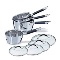 – 4 casseroles d’une capacité de 0,9 – 1,25 – 2 et 2,8 litres et de diamètres 14, 16, 18 et 20.