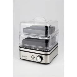 Dans ce cuiseur transparent avec la base en inox, vous pourrez cuire jusqu’à 8 œufs et une grande quantité de légumes grâce à ses deux plateaux superposés. Le cuiseur possède une contrôle électronique du temps de cuisson qui permet de programmer l’arrêt pour une cuisson parfaite ! Les plaques ont un revêtement antiadhérent, le support à oeufs est amovible et la machine est livrée avec un mesureur et perce-oeufs. Un signal sonore vous indique quand la cuisson est terminée.