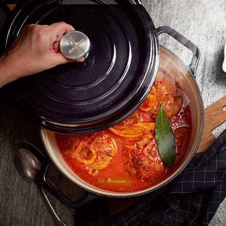 La fonte de fer émaillée est un matériau de qualité, idéal pour les plats mijotés. Elle permet une diffusion optimale de la chaleur dans la cuve de la cocotte. Grâce au couvercle équipé de picots, les gouttelettes de condensation ruissellent en continu sur vos viandes et volailles, délivrant un résultat tendre et moelleux à souhait.