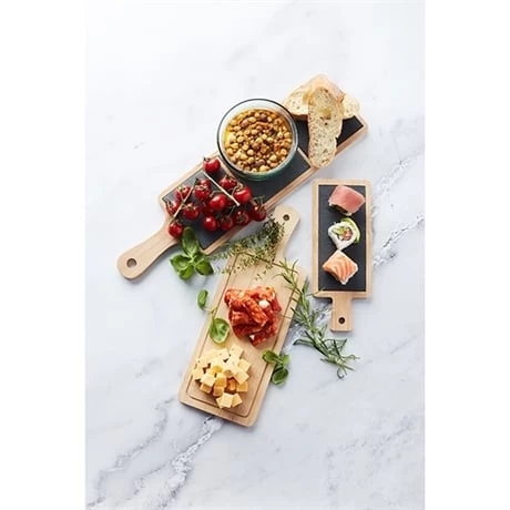 Avec ses trois zones de service, la planche à servir en ardoise grand modèle permet d’organiser des apéritifs gourmands composés de saveurs variées : charcuterie, fromages, pains, salades, légumes…