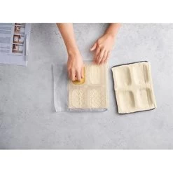 Façonnez vos rissoles ou quichettes grâce à la plaque à rissoles Betty Bossi : un kit qui vous permettra de faire de A à Z des petits plats originaux à garnir selon vos envies. Une fois votre pâte préparée, ou une pâte du commerce achetée puisque ce kit est calqué sur des dimensions normées, apposez-la sur la plaque à rissoles puis appliquez le tampon à l’intérieur des 4 rissoles pour les décorer. Vous pouvez au choix faire un passage ou deux pour varier les motifs, ou les créer vous-mêmes au couteau si vous préférez laisser parler votre imaginaire. Ensuite, à vous de choisir entre des rissoles fermées ou des quichettes ouvertes. Dans le premier cas, un pochoir en plastique vous aidera à former vos rissoles une fois la deuxième pâte appliquée. Plus qu’à enfourner pour déguster vos préparations.
