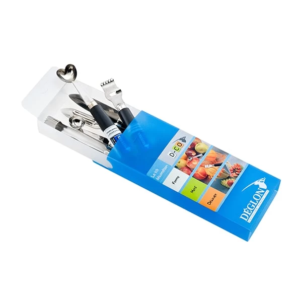 Composé des essentiels pour confectionner des décorations réussies, ce set comprend 6 ustensiles facile à utiliser. Le moule à pomme ou cuillère à pomme, en forme de demi-sphère d’un diamètre de 22 mm, permet de lever rapidement des petites boules dans la chair des fruits ou légumes. Affutée et précise, elle découpe des billes de carotte, d’avocat, de melon, de pastèque… d’une forme parfaite. Avec la cuillère d’amour, c’est un jeu d’enfant de former des cœurs dans une pâte ou des fruits pour élaborer un dessert de Saint-Valentin. Le vide pomme, quant à lui, est doté d’une lame circulaire de 15 mm de diamètre et assure l’évidage central du fruit en un seul geste. Le set propose également un ustensile multifonctions pour droitier, le décozest, afin de travailler artistiquement agrumes ou légumes en ciselant de fines lanières mais aussi de tailler de beaux zestes de peau de manière à parfumer les boissons, les crèmes, les glaces par exemple. Enfin vous trouverez un décofruit petit modèle de 8 cm pour taillader en zigzag melon et agrumes grâce à une lame en forme de V tandis que l’éplucheur permettra aux droitiers et aux gauchers d’éplucher légumes ou fruits de façon nette et rapide à l’aide de sa lame particulièrement tranchante.